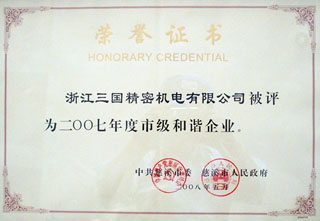 2007年广大干部职工在公司党委的正确领导下,深入贯彻集团公司精神及各项工作部署,紧紧围绕职工关心的收入分配、社会保险等事项积极开展工作,得到了中共慈溪市委充分肯定。在2007年度的全市和谐企业综合评估中,成绩优异,被授予和谐企业称号。