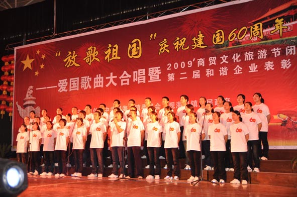 9月26日下午,我浙江三国公司参加了在观海卫镇中心小学体艺馆内举行的“放歌祖国”观海卫镇庆祝建国60周年爱国歌曲大合唱,参加的全体员工声情并茂地演绎了对伟大祖国的祝福与热爱之情,以《歌唱祖国》、《我的中国心》这两首歌曲感染了在场的每一个人.